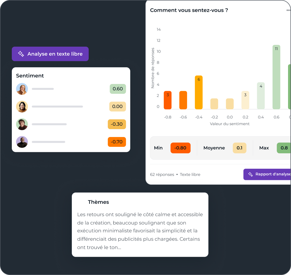 Fini les suppositions, les panels lents ou les focus groups coûteux. Notre plateforme mobile-first vous offre des insights instantanés des consommateurs sur les éléments créatifs qui comptent le plus : attrait visuel, impact émotionnel, clarté du message, adéquation avec la marque et intention d’achat.