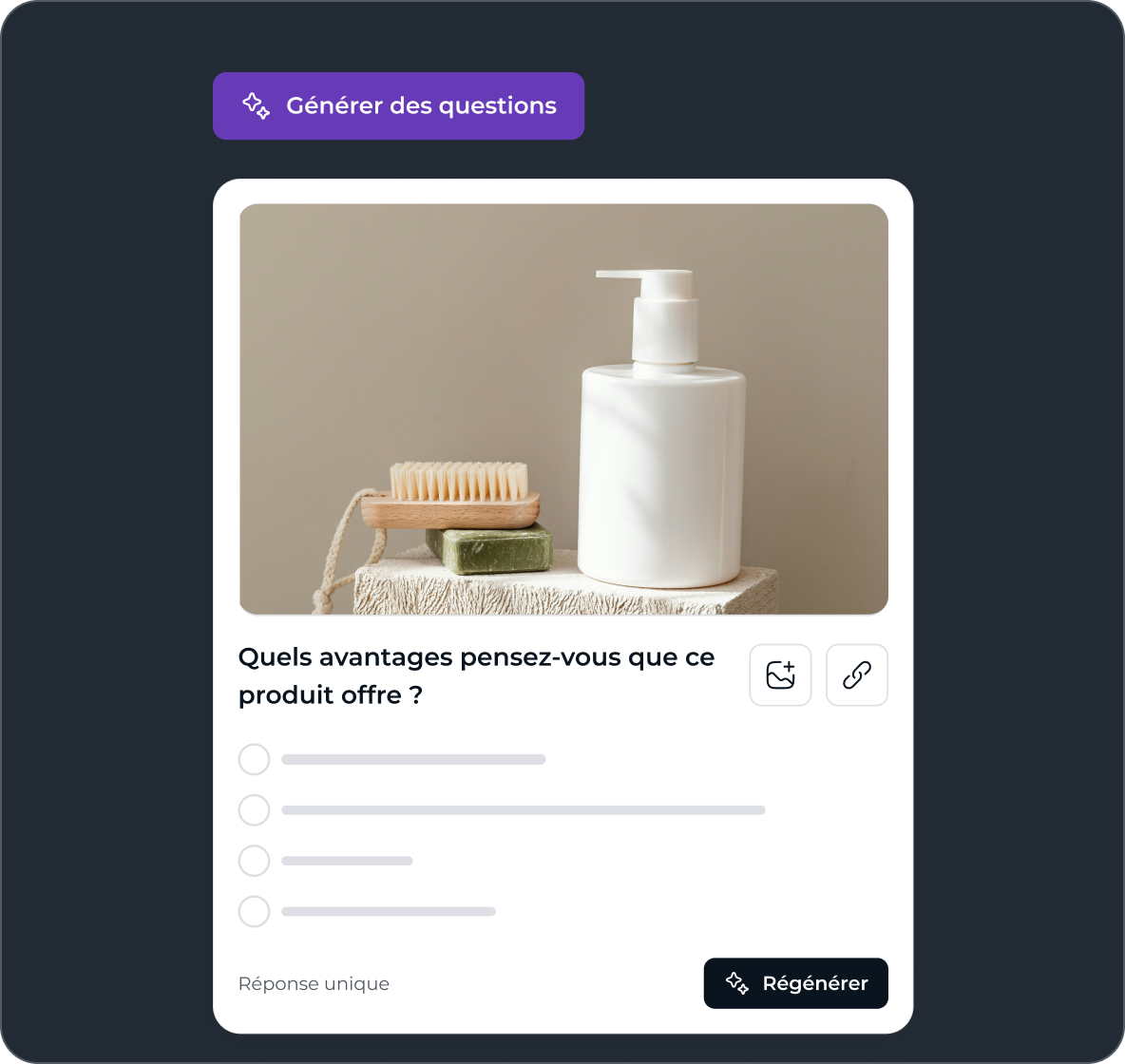 Téléchargez des visuels, des extraits vidéo, des maquettes ou des assets créatifs complets directement dans votre Pulse. Laissez les gens réagir à ce qu’ils voient, pas seulement à ce qu’ils lisent. Les tests visuels de concept mènent à un feedback plus clair, plus exploitable et reflétant l’impact réel.