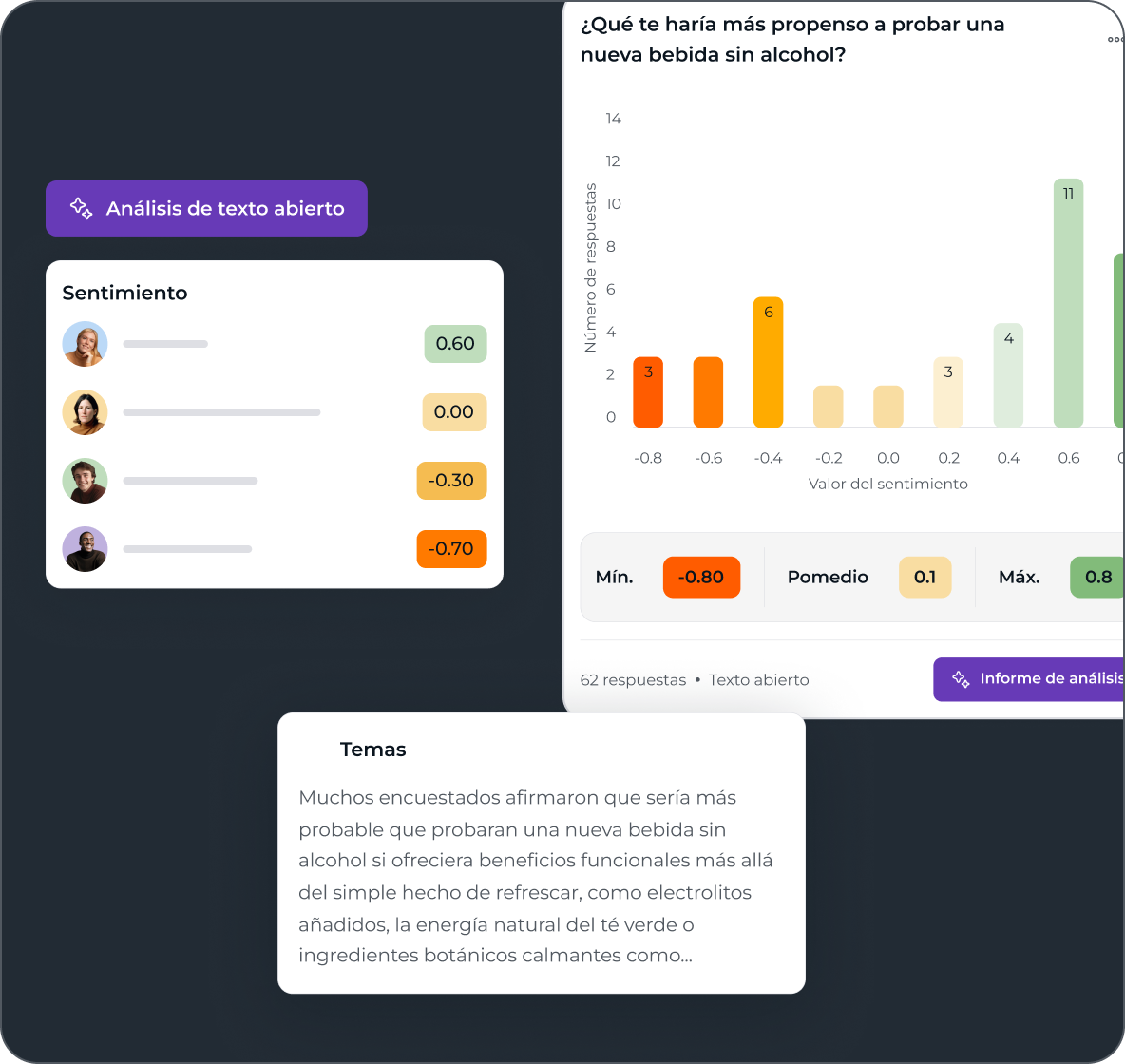 La nostra piattaforma utilizza l’AI per analizzare istantaneamente le risposte testuali, rilevare il sentiment ed evidenziare i temi chiave. Non servono classificazioni manuali o fogli di calcolo. Preferisci il tuo flusso di lavoro? Puoi esportare i dati grezzi in qualsiasi momento per reportistica e analisi avanzata.