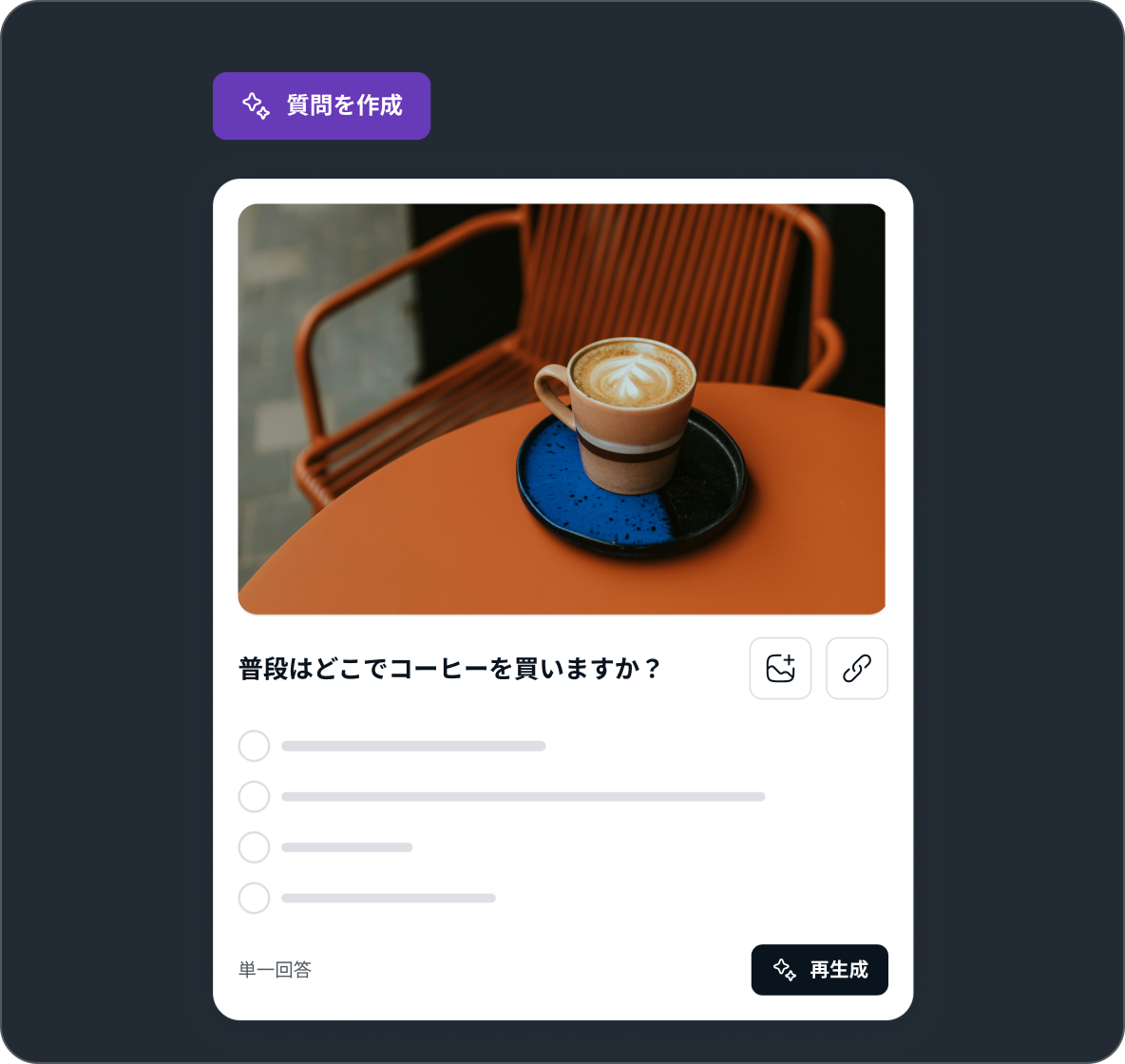 ニッチ市場の探索、クリエイティブの検証、製品ポジショニングの改善など、OnePulse は遅い調査サイクルを即時で実用的なインサイトに置き換えます。素早くコンセプトをテストし、頻繁に改善を繰り返し、タイムラグなしで賢明な意思決定を実現しましょう。