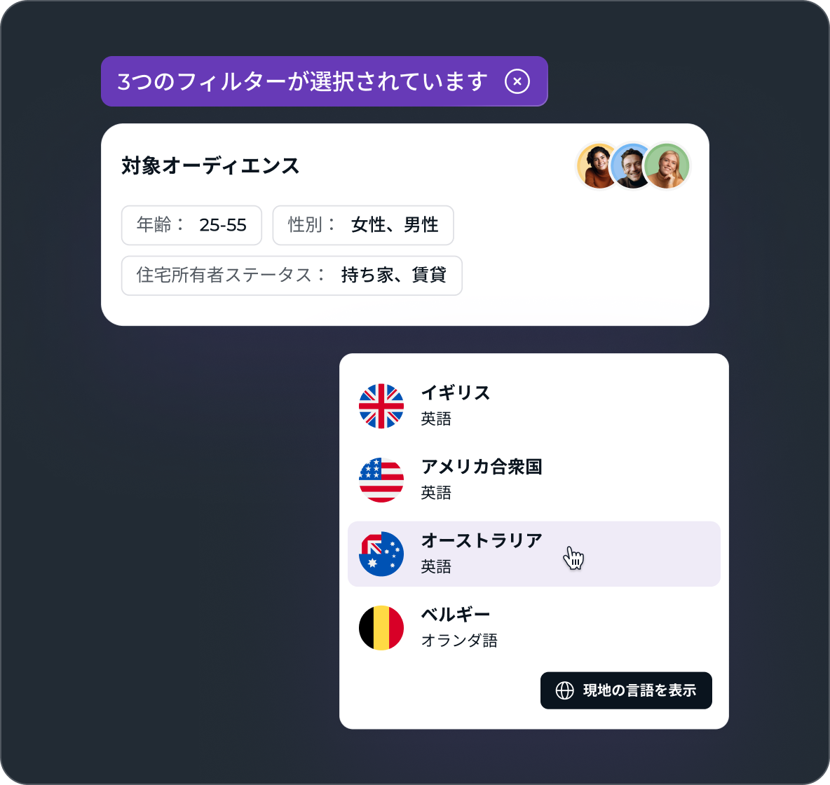 OnePulse で未開拓の可能性を発見しましょう。私たちのプラットフォームはターゲット地域の実在する消費者とつなぎ、市場需要を評価し、文化的背景を理解し、現地の嗜好を把握するのに役立ちます。推測に頼るのはやめて、確実な市場インテリジェンスを得て自信を持ってローンチしましょう。
