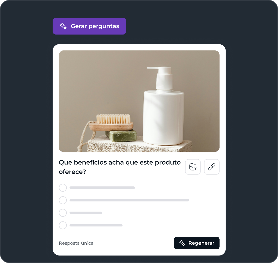 Carregue imagens, clipes de vídeo, mockups ou recursos criativos completos diretamente no seu Pulse. Deixe as pessoas responderem ao que veem, não apenas ao que leem. Os testes visuais de conceito geram feedback mais claro, acionável e que reflete o impacto no mundo real.